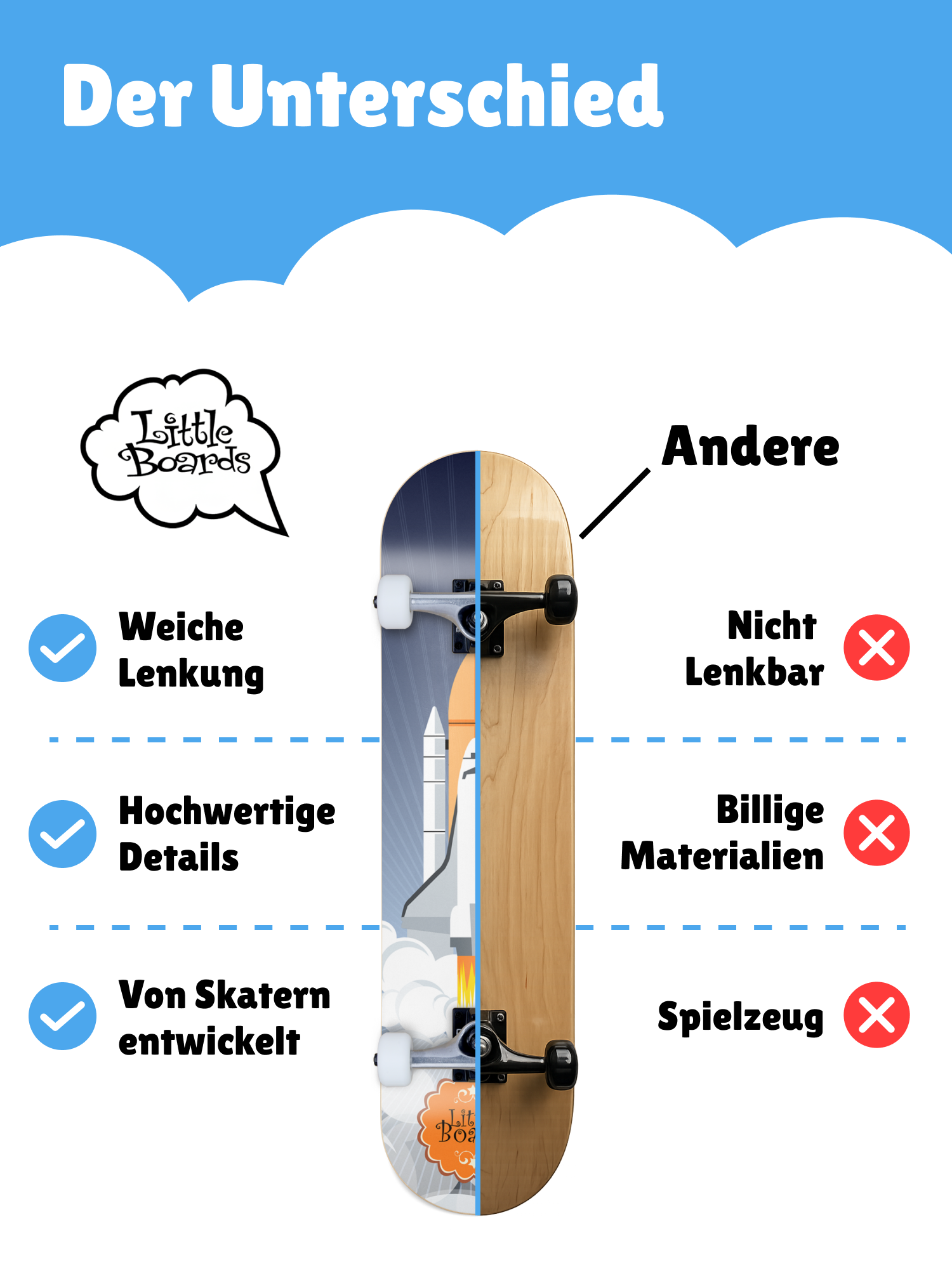Σε αντίθεση με τα παιχνίδια-skateboards από καταστήματα παιχνιδιών, η Little Boards προσφέρει αυθεντική ποιότητα skateboard — σε μικρότερη κλίμακα, αλλά επαγγελματικά κατασκευασμένη. Τέλειο για τις πρώτες προσπάθειες, για ασφαλή εκμάθηση και για μακροπρόθεσμη απόλαυση του skateboarding.