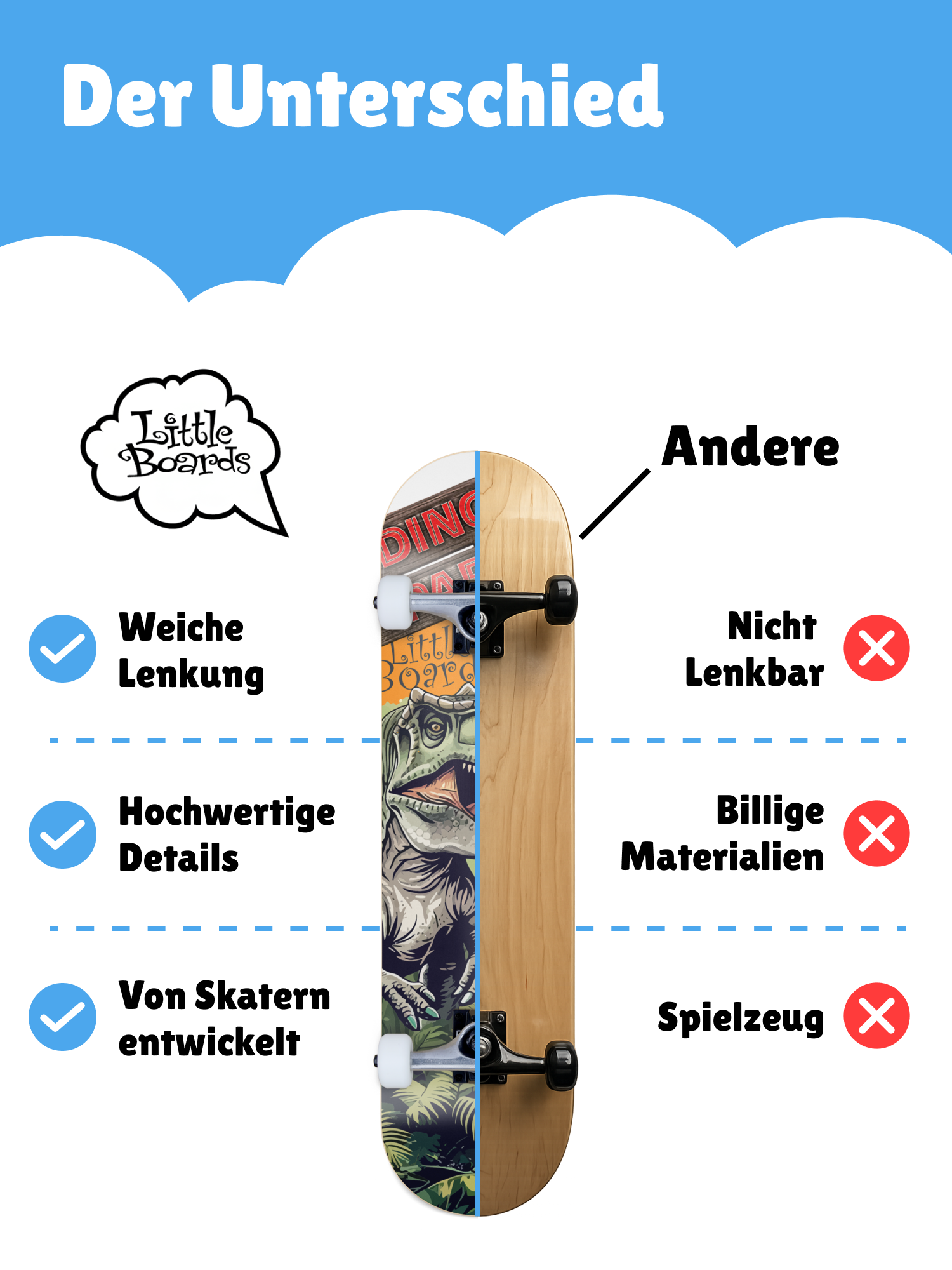 Contrairement aux skateboards jouets des magasins de jouets, Little Boards offre une véritable qualité de skateboard — à plus petite échelle, mais fabriqué professionnellement. Parfait pour les premières tentatives de rouler, pour apprendre en toute sécurité et pour un plaisir durable du skateboard.