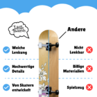 Si un enfant se tient sur un grand skateboard pour adultes, la position de ses pieds est beaucoup trop large. Avec des jambes aussi écartées, non seulement la position et donc l’équilibre deviennent incertains, mais il est presque impossible de tourner en déplaçant le poids – d’autant plus que les axes sont beaucoup trop durs. En essayant de faire un premier « olli », le tout se termine rapidement par une frustration.