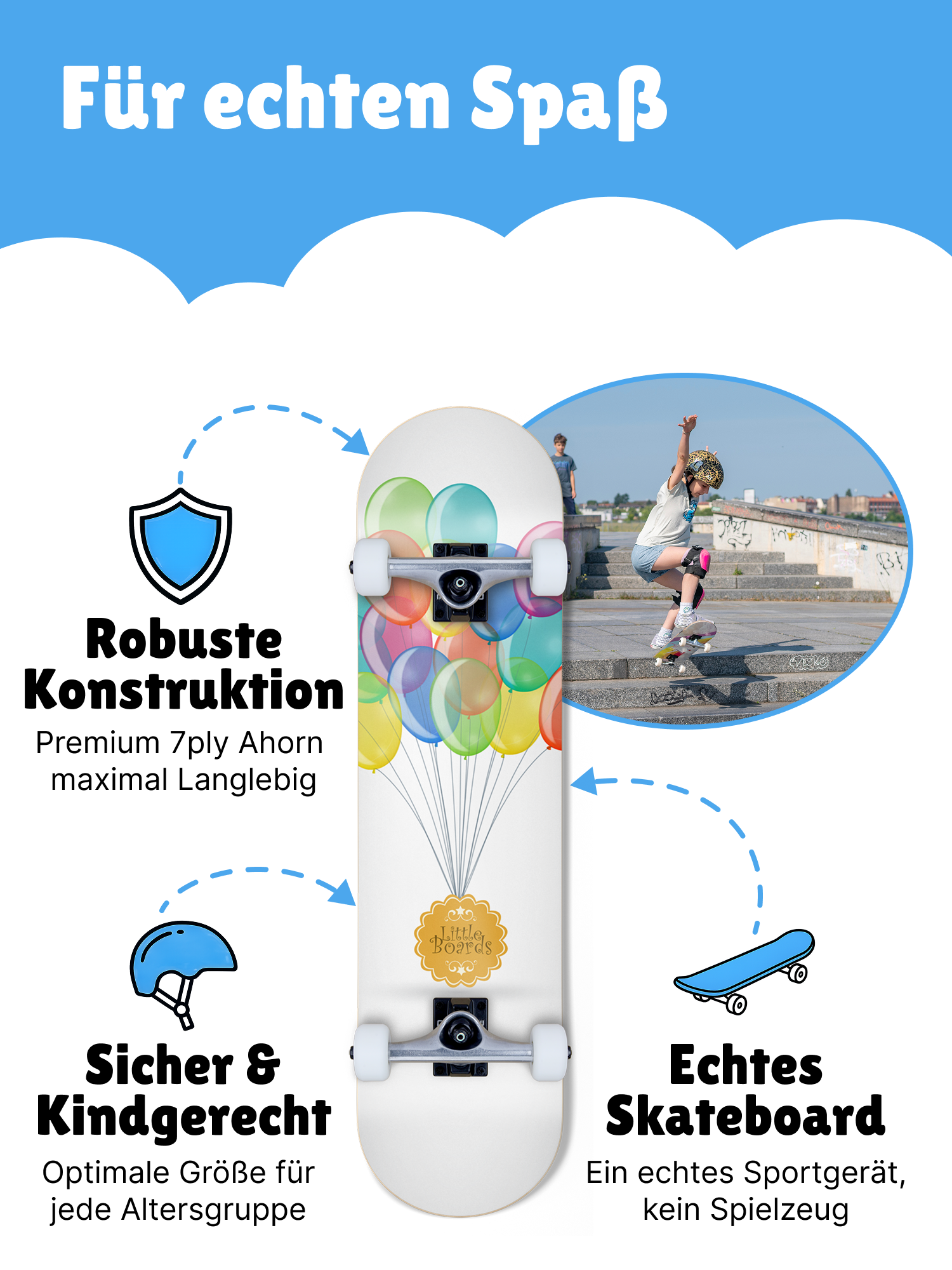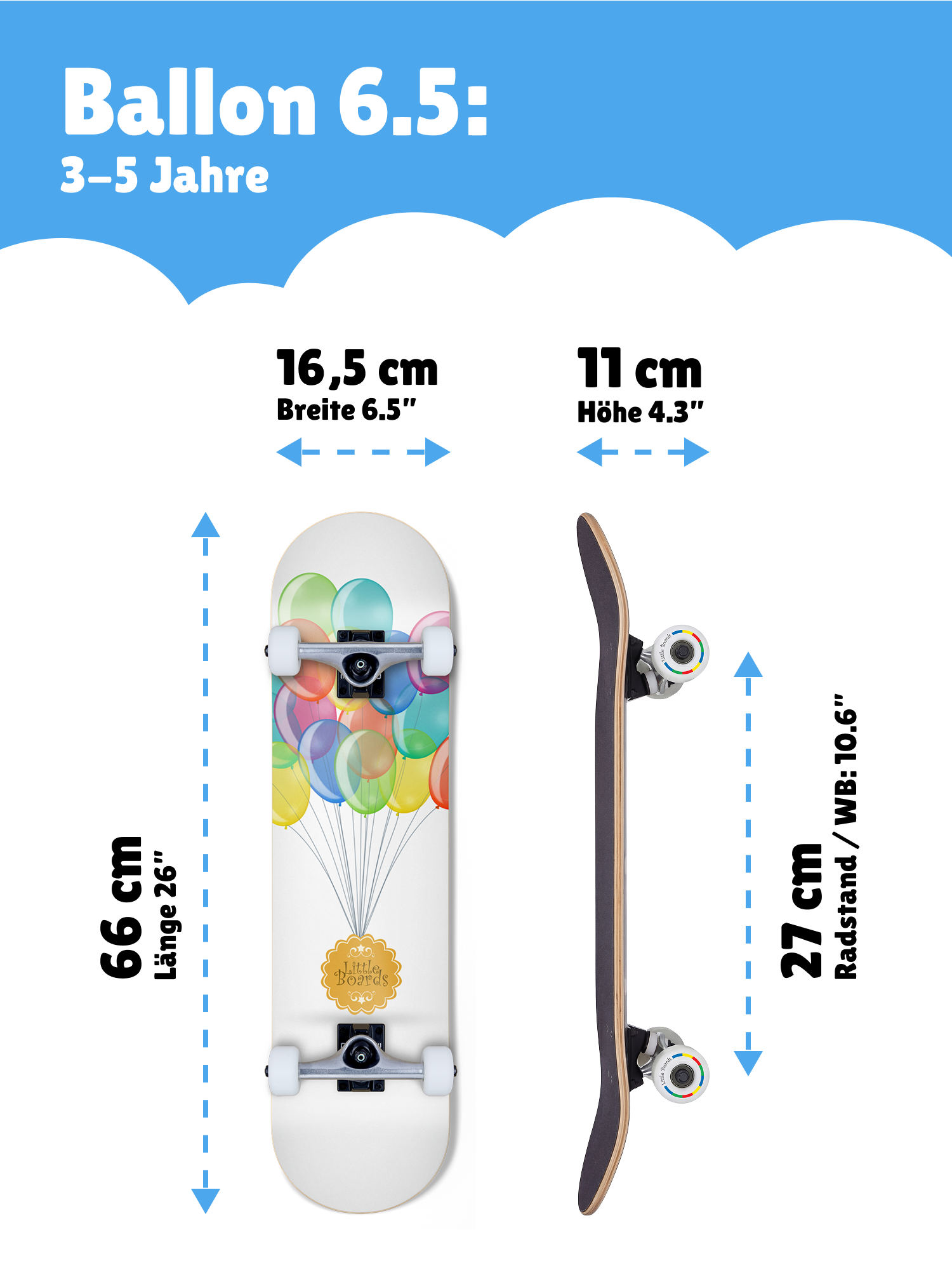 Little Boards «Balloon » 6,5″ er spesielt utviklet som Skateboard for barn som vil lære å kjøre Skateboard trygt, raskt og morsomt. Med barnevennlige proporsjoner, høy kvalitet på utførelsen og et gjennomtenkt oppsett gjør det det enklere for små skatere å komme i gang helt fra starten.